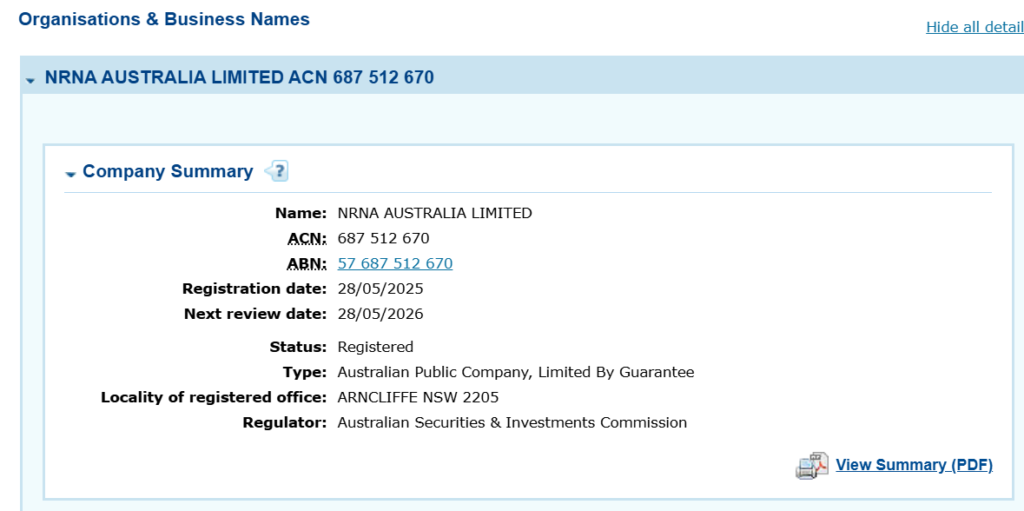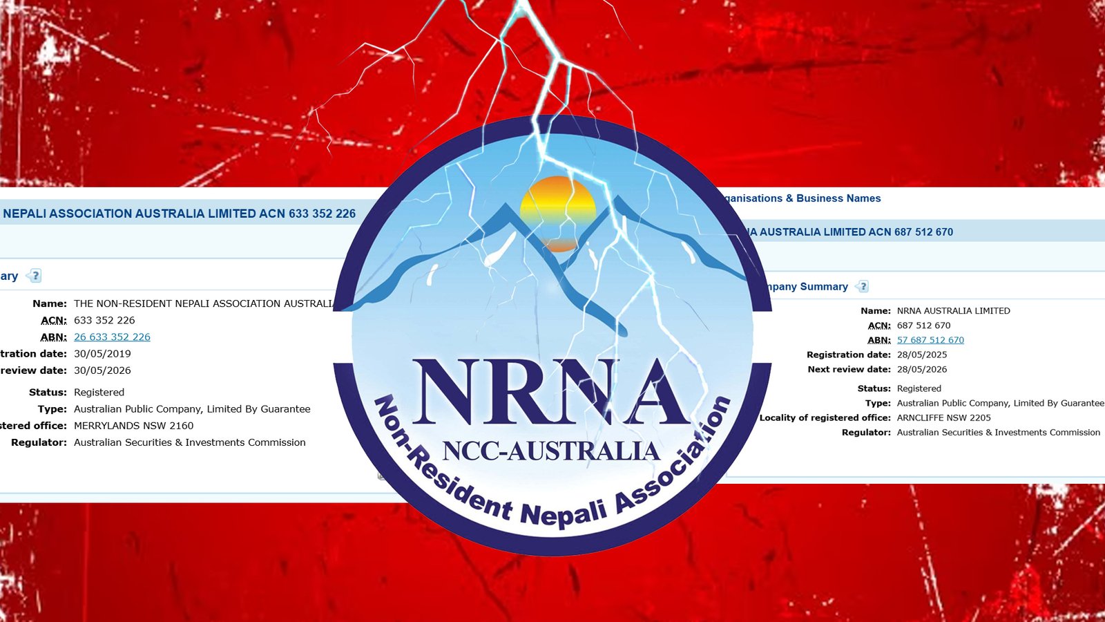 यसैबीच, महेश श्रेष्ठ नेतृत्वको समूहले NRNA AUSTRALIA LIMITED नामक संस्था अष्ट्रेलियन नियामक निकाय ASIC मा मे २८ मा दर्ता गराएको पुष्टि भएको छ।