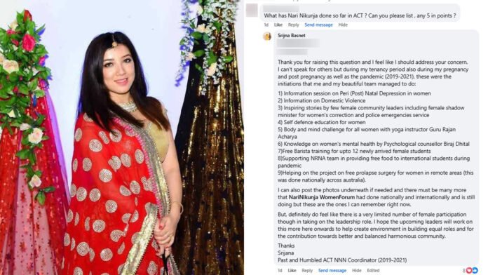 यही प्रश्नको जवाफमा नारी निकुञ्ज एसीटी की पूर्व संयोजक श्रीजना बस्नेतले उक्त फेसबुक लाइभको कमेन्ट मार्फत सार्वजनिक रूपमा आफ्नो कार्यकाल (२०१९–२०२१) का उपलब्धिहरू उल्लेख गर्दै, कठिन समयमा समेत निरन्तरता पाएको नारी नेतृत्वको भावनात्मक र प्रेरणादायी कथा प्रस्तुत गरिन्। उनी लेख्छिन् —