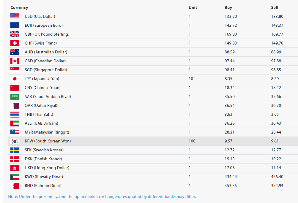 राष्ट्र बैंकका अनुसार आजको लागि अमेरिकी डलर १ को खरिददर १३३ रुपैयाँ २० पैसा र बिक्रीदर १३३ रुपैयाँ ८० पैसा निर्धारण भएको छ। हिजो अमेरिकी डलर १ को खरिददर १३३ रुपैयाँ २४ पैसा र बिक्रीदर १३३ रुपैयाँ ८४ पैसा थियो। त्यसैगरी आजको लागि युरोपियन युरो १ को खरिदर १४२ रुपैयाँ ७२ पैसा र बिक्रीदर १४३ रुपैयाँ ३७ पैसा निर्धारण भएको छ। हिजो युरो १ को खरिदर १४२ रुपैयाँ ९५ पैसा र बिक्रीदर १४३ रुपैयाँ ५९ पैसा थियो। आजको लागि बेलायती पाउन्ड १ को खरिददर १६९ रुपैयाँ र बिक्रीदर १६९ रुपैयाँ ७७ पैसा निर्धारण भएको छ। हिजो पाउन्ड १ को खरिददर १६८ रुपैयाँ ७१ पैसा र बिक्रीदर १६९ रुपैयाँ ४७ पैसा थियो।