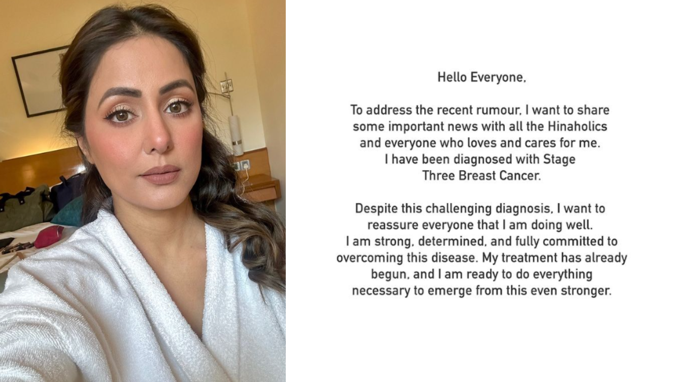 भारतकी चर्चित टिभि अभिनेत्री हिना खानलाई स्तन क्यान्सर भएको छ ।अभिनेत्रीले शुक्रबार सामाजिक सञ्जालमा एक पोस्ट सेयर गर्दै यो जानकारी दिएकी हुन् । अभिनेत्रीले लेखेकी छिन्, ‘हालसालै फैलिएको अफवाहबारे म तपाईसँग केही महत्वपूर्ण समाचार साझा गर्न चाहन्छु । म स्तन क्यान्सरको तेस्रो चरणमा छु ।हिनाले थप लेखिन्, ‘म मलाई माया गर्ने र हेरचाह गर्ने सबै मानिसहरूसँग केही महत्त्वपूर्ण समाचार साझा गर्न चाहन्छु । मलाई तेस्रो चरणको स्तन क्यान्सर छ । यति हुँदाहुँदै पनि म ठीक छु भनेर सबैलाई भन्न चाहन्छु । म बलियो र दृढ छु र यस रोगलाई जित्न पूर्ण रूपमा प्रतिबद्ध छु । मेरो उपचार सुरु भएको छ र म यसलाई पराजित गर्न हर सम्भव प्रयास गर्न तयार छु ।’हिना खानले फ्यानसँग गोपनियताको माग गरेकी छिन् । अभिनेत्रीले लेखेकी छन्, ‘यस समयमा म तपाईबाट केही सम्मान र गोपनीयता चाहन्छु । म तपाईंको माया र प्रार्थनाको कदर गर्छु। म मेरो परिवार र नजिकका मानिसहरूसँग सकारात्मक रहनेछु ।’हिना ये रिस्ता क्या कहलाता है सिरियलबाट घर घरमा चर्चित बनेकी थिइन् । त्यसपछि उनले चर्चित रियालिटी शो बिग बोसबाट निकै चर्चा बटुलेकी थिइन् । बिग बोस पछि उनले केहि फिल्ममा समेत काम गरेकी छन् ।