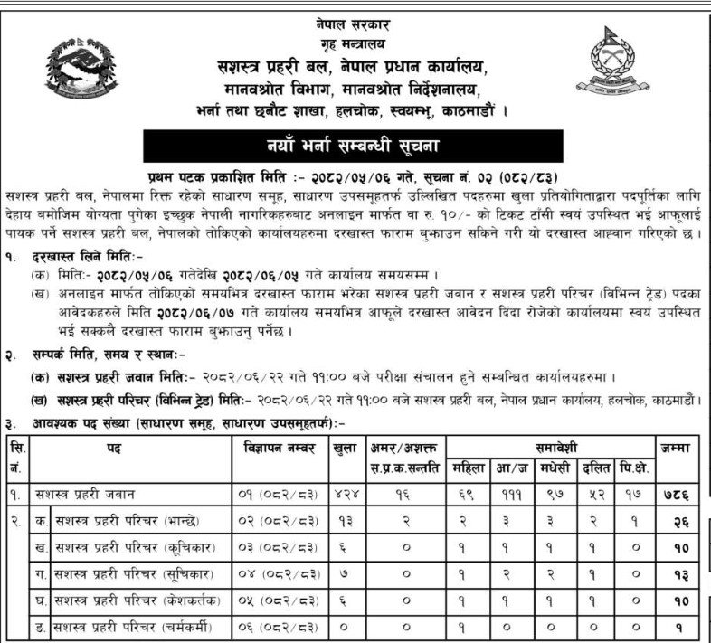 साधारण समूह तथा साधारण उप–समूहअन्तर्गत रिक्त पद पूर्तिका लागि दरखास्त आह्वान गरिएको सूचनामा उल्लेख छ। सशस्त्र प्रहरी जवान पदमा मात्रै ८७६ जना माग गरिएको छ। त्यस्तै, भान्से २६, कुचिकार १०, सूचीकार १३, केशकर्तक १० र चर्मकर्मी १ जना गरी कुल ८४६ पद खुला प्रतियोगिताद्वारा पदपूर्ति गरिने भएको छ। योग्यता पुगेका इच्छुक नेपाली नागरिकले आजदेखि आगामी असोज ५ गतेसम्म दरखास्त दिन सक्ने सशस्त्र प्रहरीले जनाएको छ।