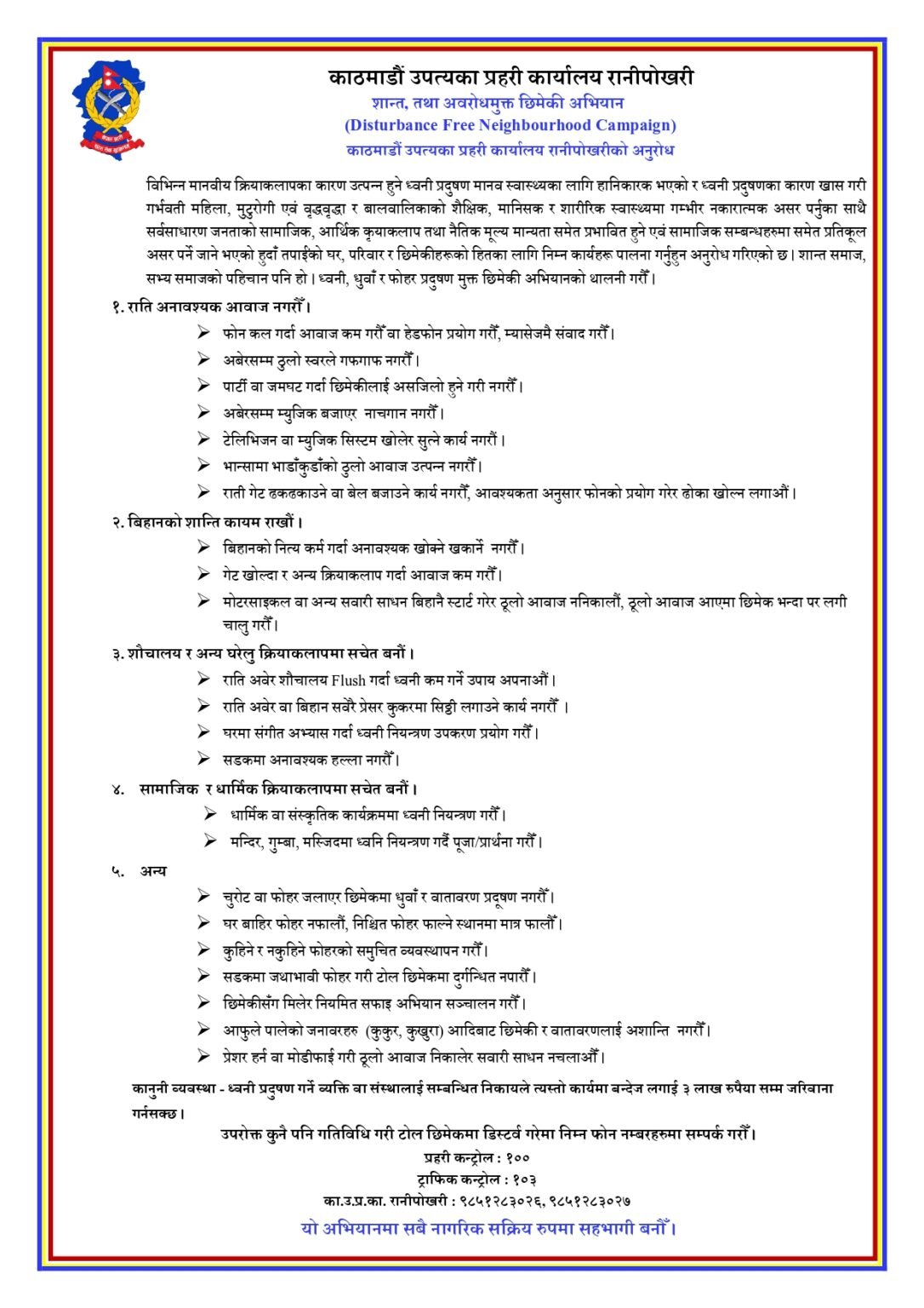 प्रहरीले राति अबेरसम्म उच्च आवाजमा म्युजिक बजाएर नाचगान नगर्न, टेलिभिजन वा साउन्ड सिस्टम अनावश्यक रूपमा ठूलो आवाजमा नचलाउन, ढोकाको बेल बारम्बार बजाउन र बिहान नित्यकर्मका क्रममा अत्यधिक खोक्दा वा खकार्दा छिमेकीलाई असुविधा नपर्ने गरी सचेत हुन पनि अपिल गरेको छ।