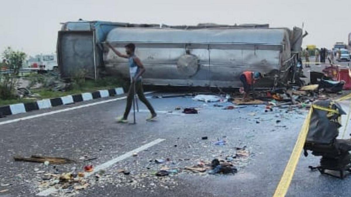 दुर्घटना उत्तर प्रदेशको राजधानी लखनउबाट ६८ किलोमिटर पश्चिममा उन्नाव जिल्लाको गाढा गाउँ नजिकै लखनऊ-आग्रा एक्सप्रेसवेमा भएको हो। प्रहरीका अनुसार बिहारको सीतामढीबाट दिल्ली जाँदै गरेको डबल डेकर बस पछाडिबाट रहेको दुधको भाँडोमा ठोक्किएको थियो ।