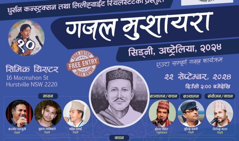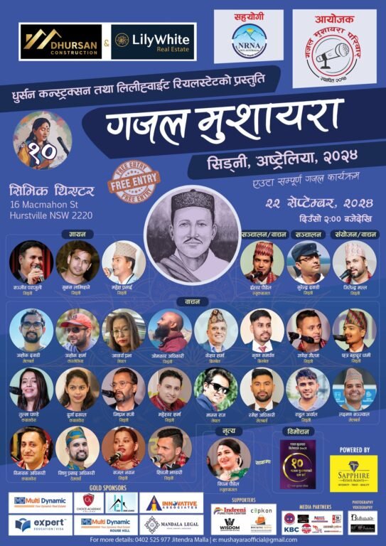 सिड्नीको हर्स्टभिलस्थित सिभिक थिएटरमा हुने यो विशेष कार्यक्रममा विश्वभर छरिएका नेपाली गजलकारहरूबीच समन्वय र सहकार्यको माध्यमबाट नेपाली गजललाई अझ परिस्कृत र प्रख्यात बनाउने उद्देश्यले कार्यक्रम आयोजना गरिएको हो।