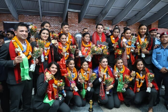 काठमाडौँ । माल्दिभ्समा सम्पन्न काभा वुमन्स भलिबल क्लब च्याम्पियनशिप प्रतियोगिताको उपाधि जितेको नेपाल प्रहरीको महिला भलिबल टोली स्वदेश फर्किएको छ । नेपाल प्रहरीको टिमलाई त्रिभुवान अन्तर्राष्ट्रिय विमानस्थलमा भव्य स्वागत गरिएको छ ।