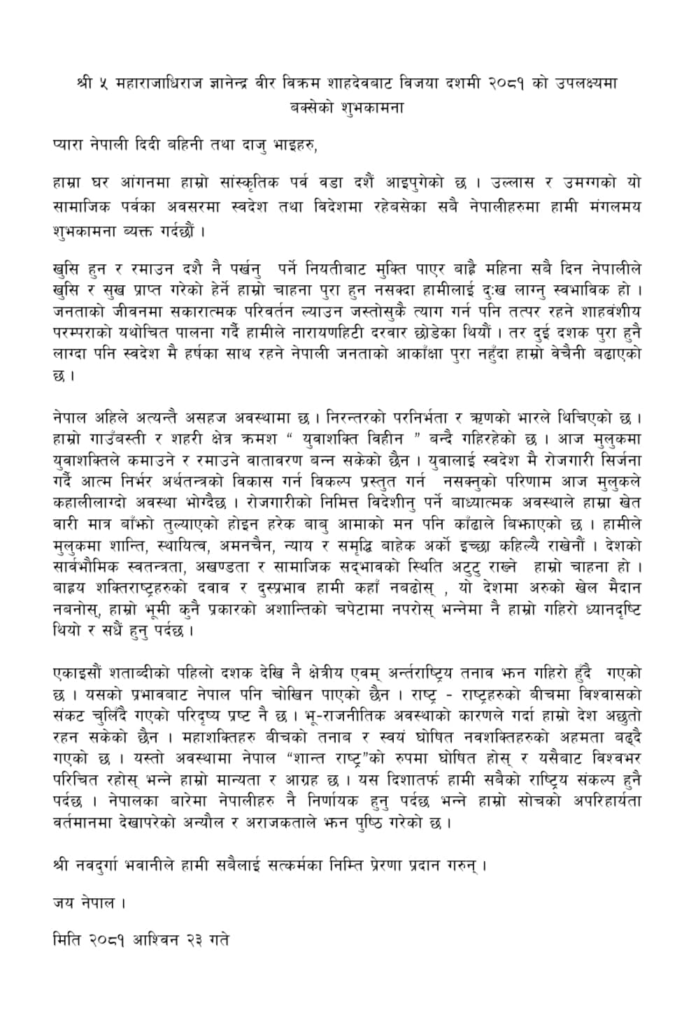 शुभकामना सन्देशमा उनले भनेका छन्, “दसैंको बेला मात्रै होइन, हरेक दिन नेपालीहरूले हर्ष र समृद्धि अनुभव गर्न पाउनु पर्ने हो । तर दुई दशक बितिसक्दा पनि जनताको आकांक्षा पूरा हुन नसक्दा हामीलाई खिन्नता भएको छ । हामीले आफ्नो पारिवारिक जिम्मेवारी पूरा गर्दै, जनताको हितका लागि नारायणहिटी दरबार छोडेका थियौं, तर देशको समृद्धिमा अपेक्षित प्रगति नभएको देख्दा मन भारी भएको छ ।”