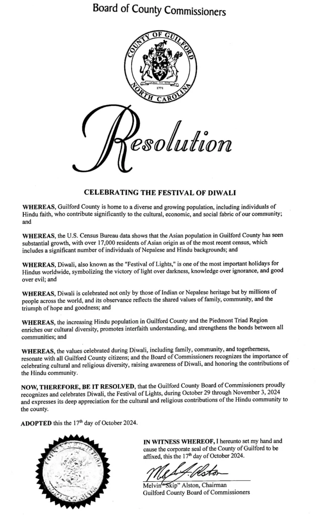अमेरिकाको नर्थ क्यारोलाइना राज्यको गीलफर्ड काउन्टीले नेपाली समुदायको दोस्रो ठूलो चाड दीपावली (तिहार)लाई मान्यता दिएको छ। यस अवसरमा गत बिहीबार आयोजित एक विशेष कार्यक्रममा गीलफर्ड काउन्टीले यस पर्वलाई महत्वपूर्ण मान्यता दिएको छ।