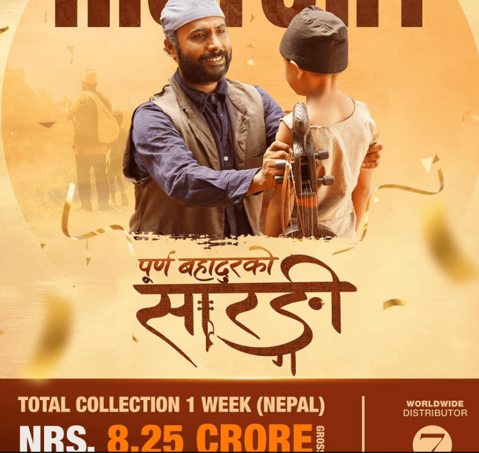 काठमाडौँ । नेपाली फिल्म ‘पूर्णबहादुरको सारङ्गी’ले रिलिज भएको एक हप्तामै रु. आठ करोड २५ लाखको आम्दानी गर्न सफल भएको छ । फिल्मका मुख्य पात्र विजय बरालले यो उपलब्धिलाई दर्शकको माया र फिल्मको गहिरो कथासँग जोड्दै सिनेमा हलमा उत्साहजनक प्रतिक्रिया मिलेको बताए।