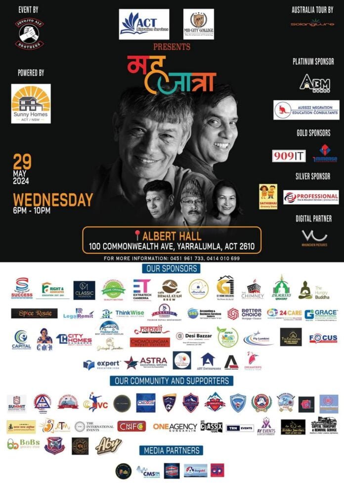 त्यसैगरी JAbrothers को प्रस्तुतिमा अस्ट्रेलियाको राजधानी क्यान्बेरामा २९ मे मा बेलुकी ६ बजे देखि १० बजे क्यन्बेराको albarthall मा महजात्रा कार्यक्रम हुने छ।