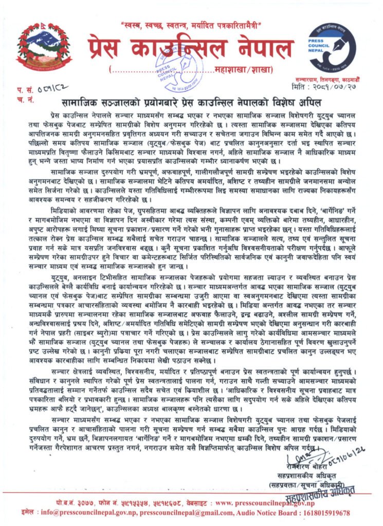 पछिल्लो समय कतिपय सामाजिक सञ्जाल (युट्युब/फेसबुक पेज) बाट प्रचलित कानुनअनुसार दर्ता भइ स्थापित सञ्चार माध्यमप्रति वितृष्णा फैलाउने गरी गलत भाष्य निर्माण गर्न भएका प्रयासप्रति काउन्सिलको गम्भीर ध्यानाकर्षण भएको समेत विज्ञप्तिमा जनाइएको छ ।