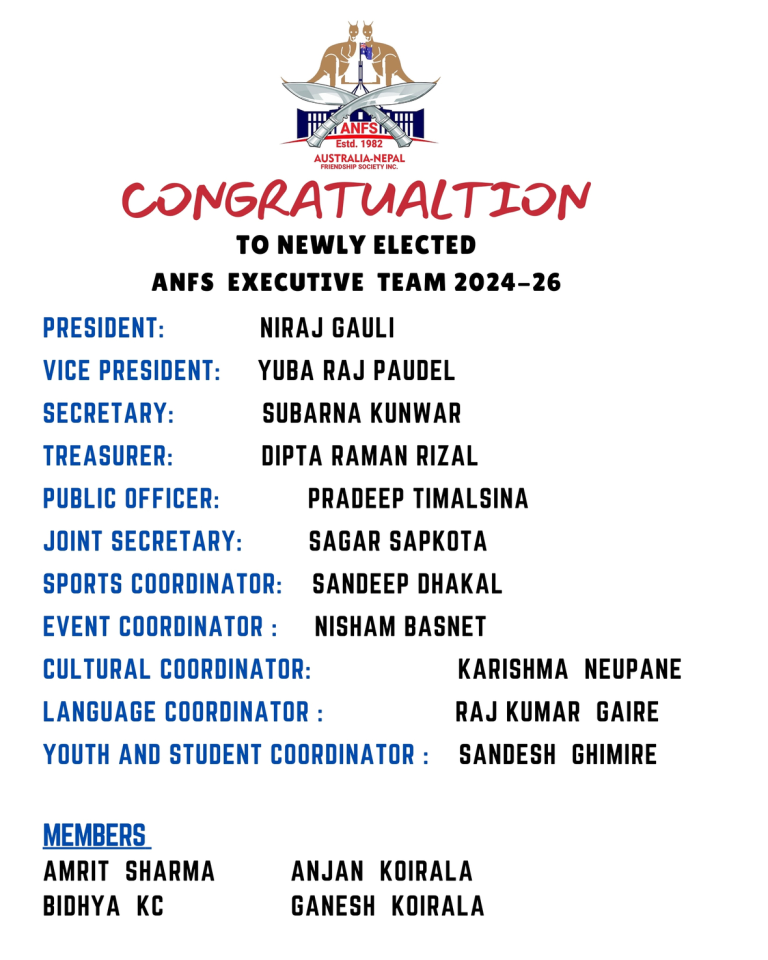 क्यानबेरामा रहेको पुरानो संस्था अष्ट्रेलिया नेपाल फ्रेण्डसिप सोसाइटिको साधारण सभा सम्पन्न भएको छ । मे २६ आइतबारका दिन होल्ट नेवरहुड हलमा सम्पन्न यस साधारण सभाले नयाँ कार्यसमिती चयन गरेको छ।